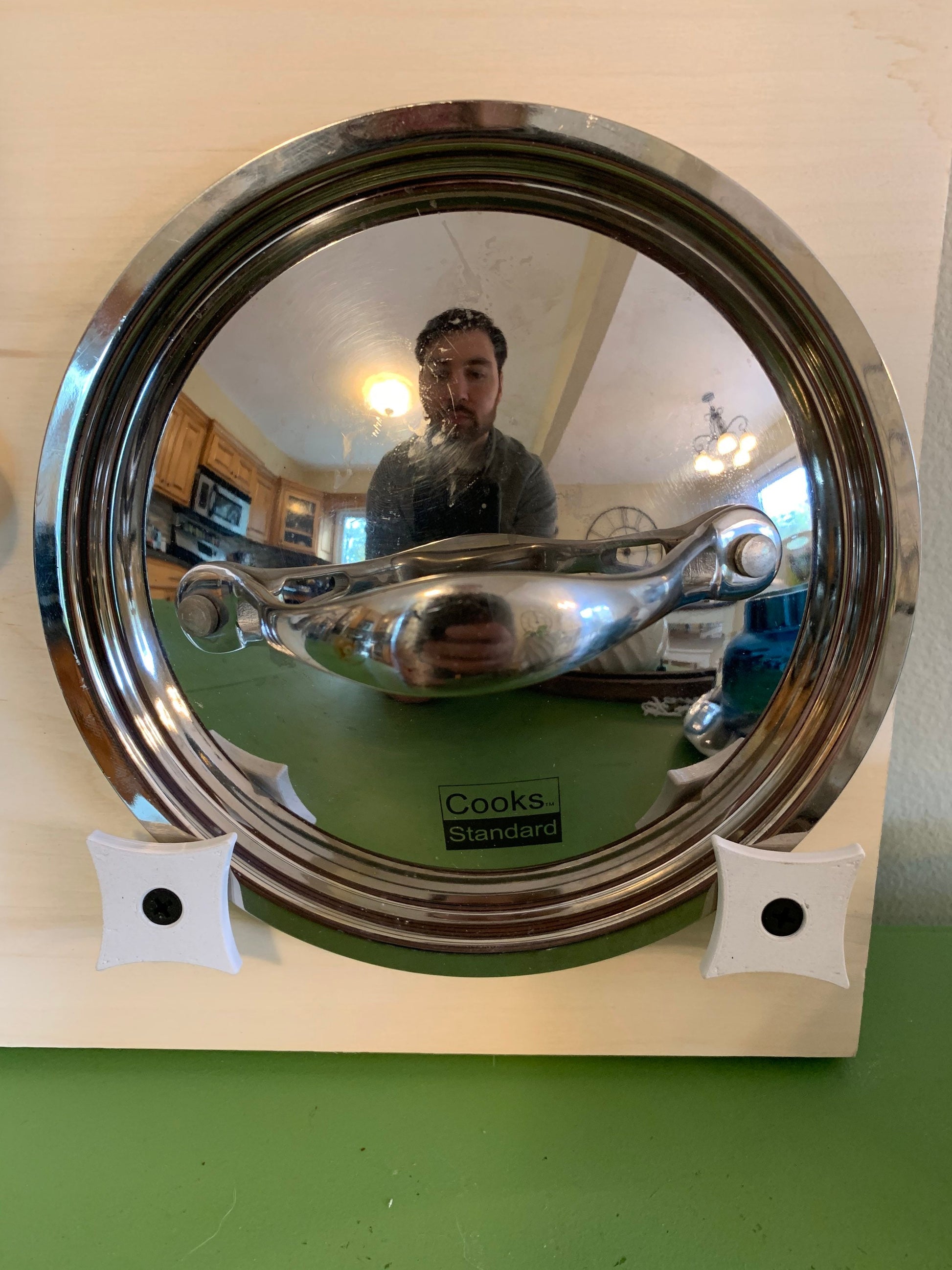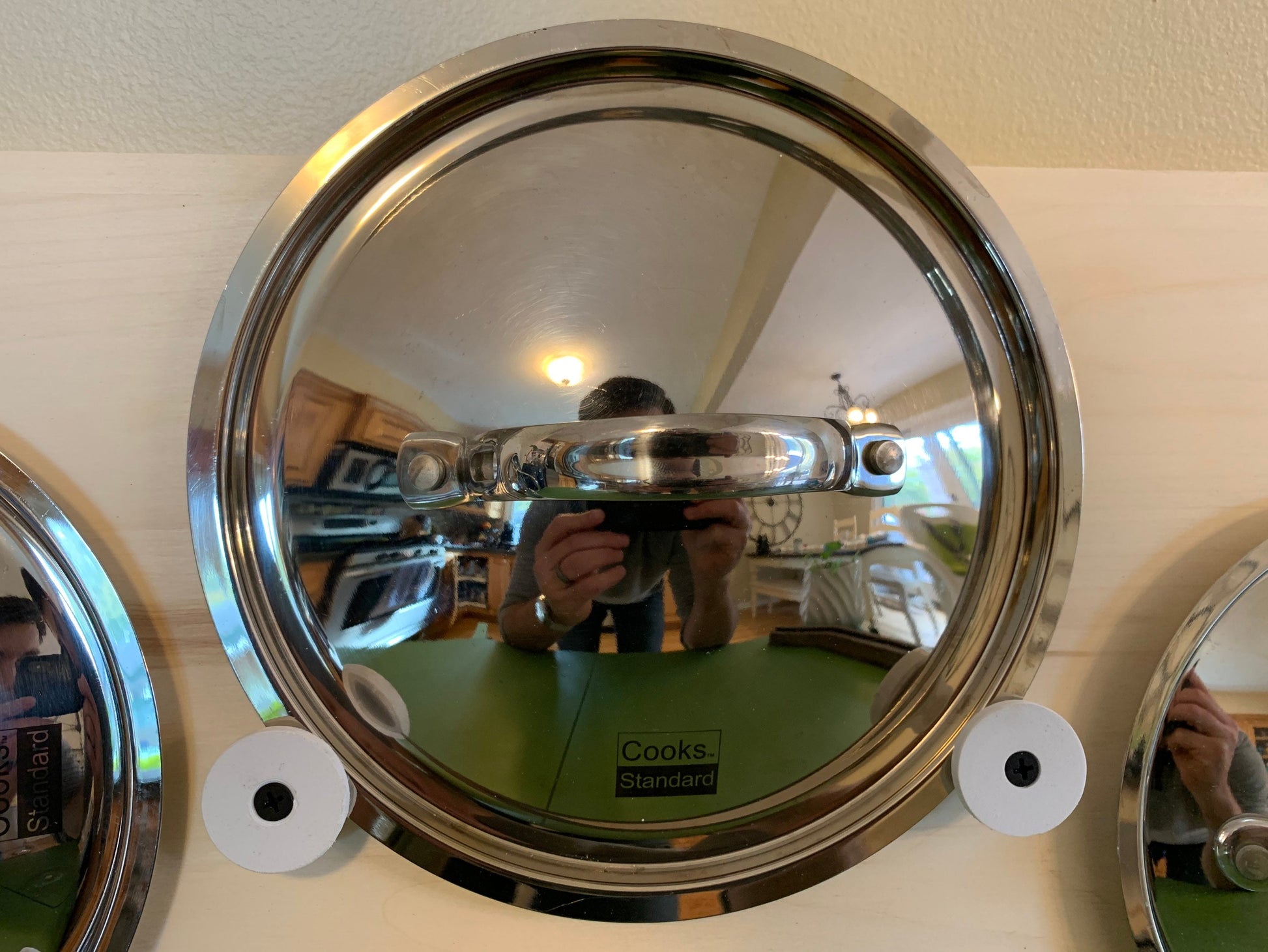 Great for hanging pot lids out of the way on pantry or cabinet doors! Each holder mounts with a single a screw (1.25” length screws provided, displayed design results in 0.5” screw depth into the mounting material)